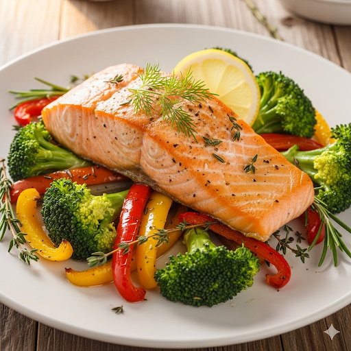 연어 스테이크 + 구운 채소 (브로콜리, 파프리카)